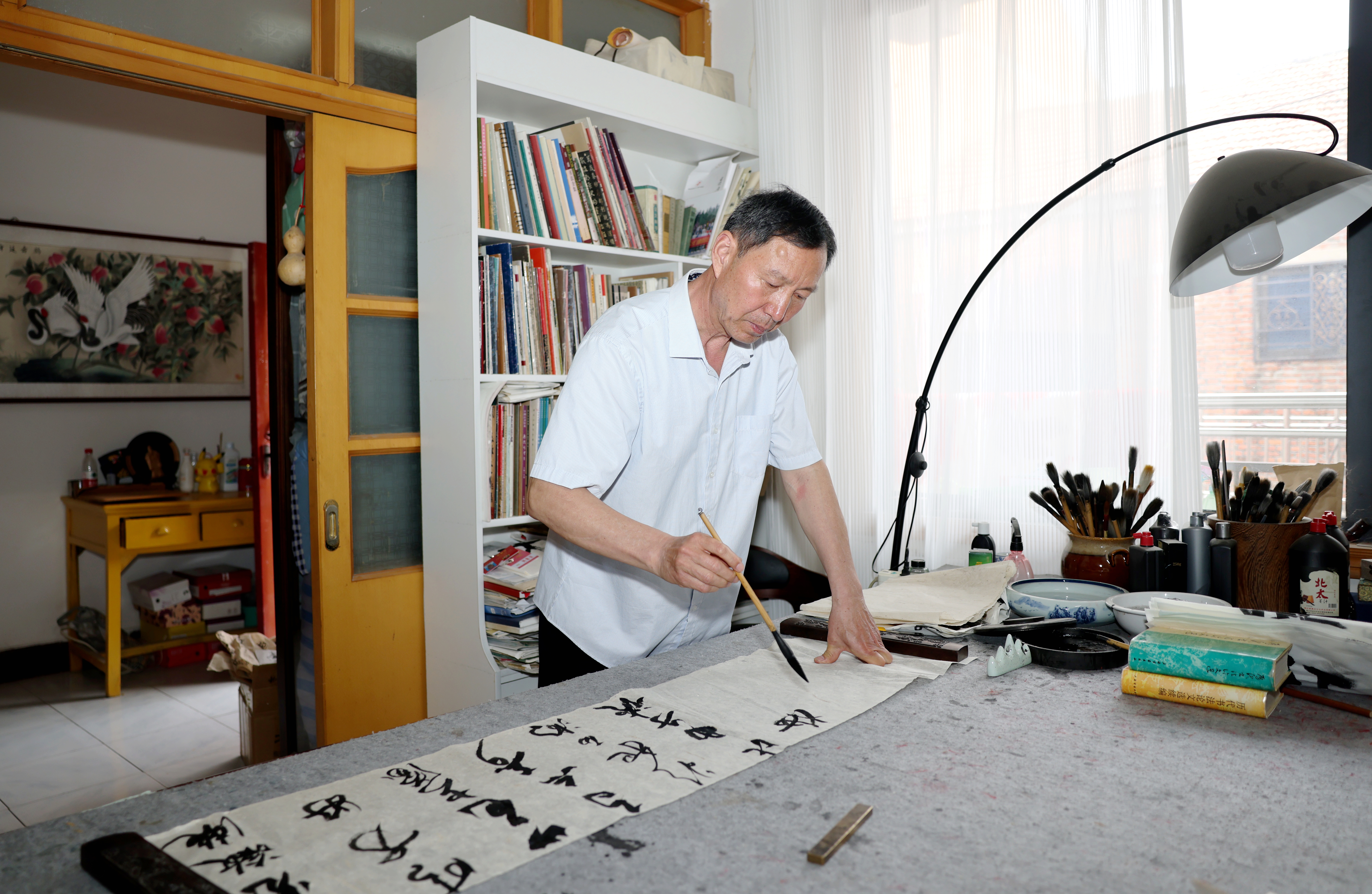 4月17日,记者走进崔传明的居家小院,映入眼帘的木板雕刻“萧竹堂”匾额张挂门楣。在二楼,一张宽大的写字桌用于创作,一边是整齐摆放的宣纸,书柜装满了各类碑帖和艺术理论书籍,四壁挂满了他的临创书作或高堂大轴或书卷精品。置身其中,如沐春风——张扬起伏的线条给人以丰富想象,或润如春雨,或干裂秋风,或小桥流水潺潺,或钟鼓在耳鼓角争鸣……崔传明娓娓道来,深入浅出地讲解把我们带进了书法艺术的宏伟殿堂。书桌上濡墨未干的字迹,正将一方笔墨化作千顷桃李竞相开放,也正是一位乡村少年走向书法名师的见证,从默默耕耘到“书法终身成就奖”。殊荣的背后,有多少辛勤付出的汗水,流传着多少感人的育人的故事啊!